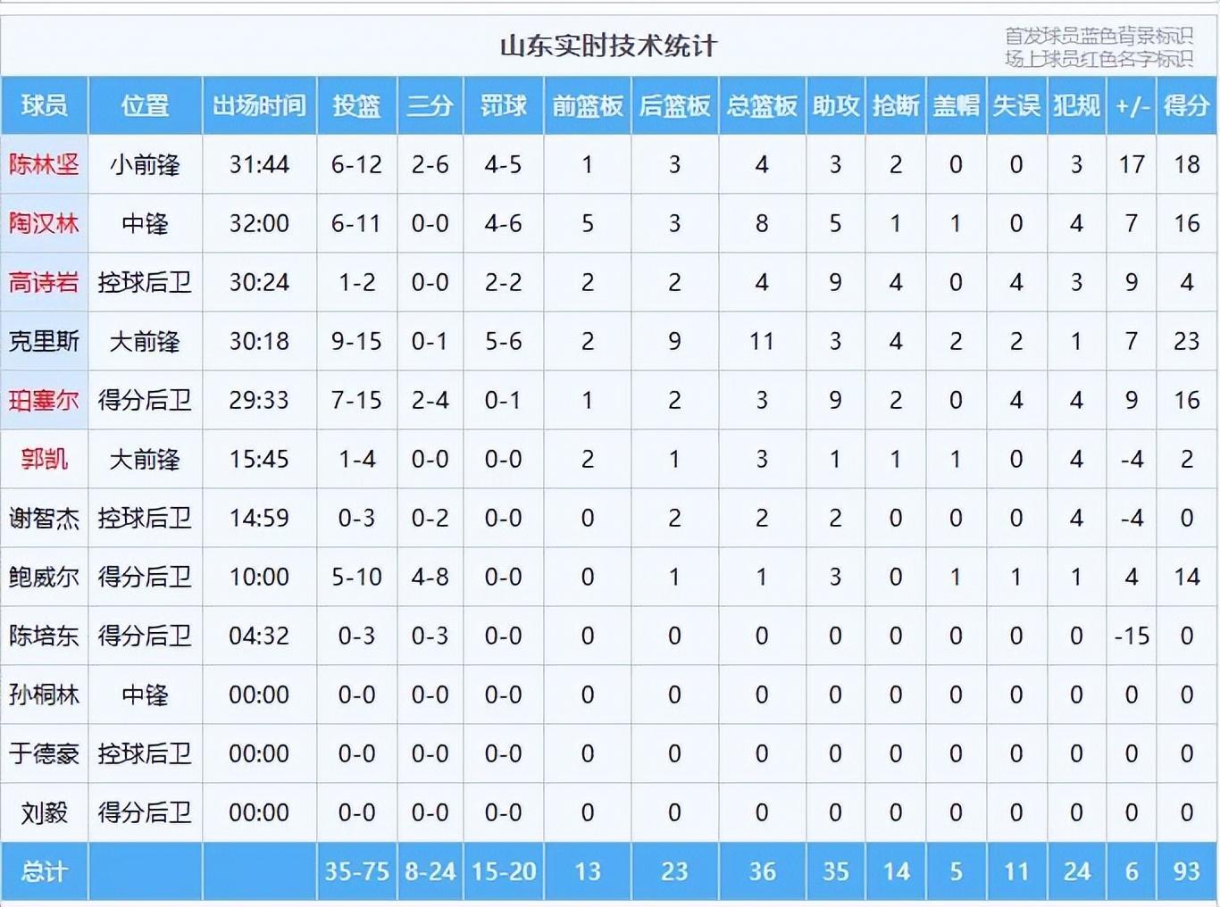 他们在助攻数上以35比13遥遥领先,全队五人得分上双。外援克里斯得到23分和11个篮板,并送出4次抢断,陈林坚命中4记三分球,贡献18分,陶汉林得到16分和8个篮板,高诗岩虽然只得到4分,但送出了9次助攻。